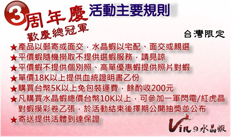 Vinの水晶蝦開幕至今已正式跨入第四年嘍!感謝蝦友長期的照顧與支持!本月的三周年慶活動同時也是歡慶2018年德國水晶蝦國際邀請賽榮獲全場總冠軍的榮耀共同舉辦。因店內空間有限,今年周年慶慶生方式以採官網特價優惠的直購活動為主,本活動僅限台灣蝦友哦! (#海外不寄送#)