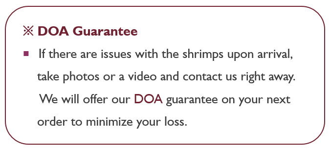 when you receive shrimps there are some problems occurred in a bag please take photos or video to show us immediately. We will provide our DOA guarantee in your next order and shipment.