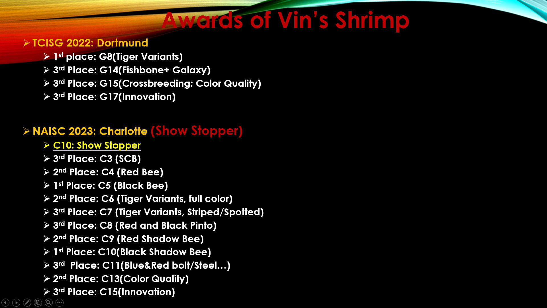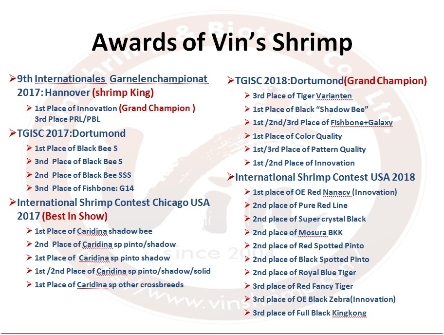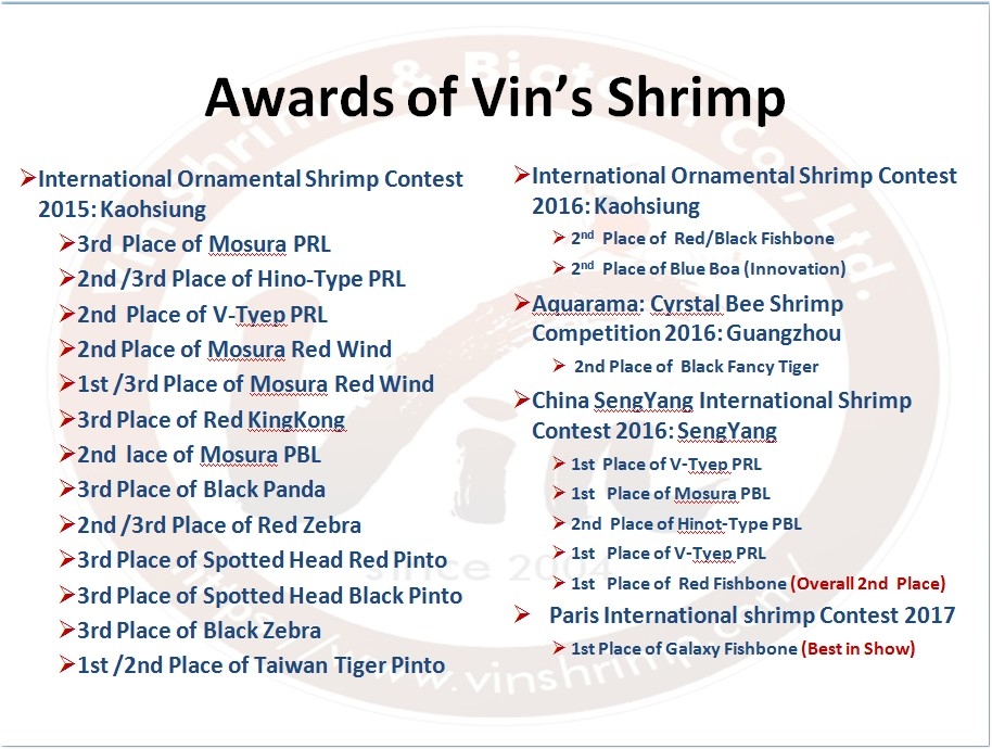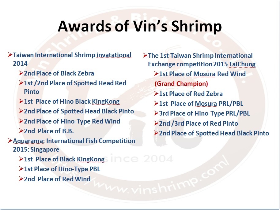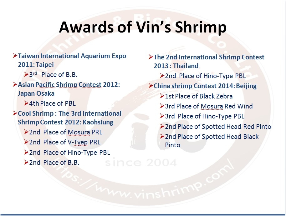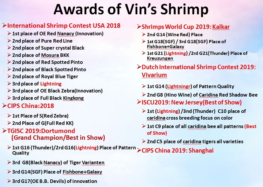 本頁為近幾年來Vinの水晶蝦的全系統水晶蝦參與國、內外水晶蝦賽事的得獎全記錄,從台灣、日本、泰國、新加坡、中國大陸遠至於德國、法國、荷蘭與美國等,真的不是件輕鬆容易的事啊,續繼加油^^